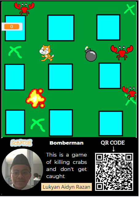 Assalammuallaikum Warahmatullahi Wabarakatu. This time I will explain about a game I made called Bomberman. So there we are told to kill the crabs that are there and don’t get caught by the crabs. Maybe that’s my explanation.