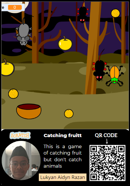 assalamualaikum warahmatullahi wabarakatuh here I will explain about the catching fruit game that I made. the catching fruit game is a game where we are told to catch fruit and insects. if for example we catch fruit then our score will increase our score and vice versa if we catch insects, our score will decrease. Maybe that’s my explanation about the catching fruit game