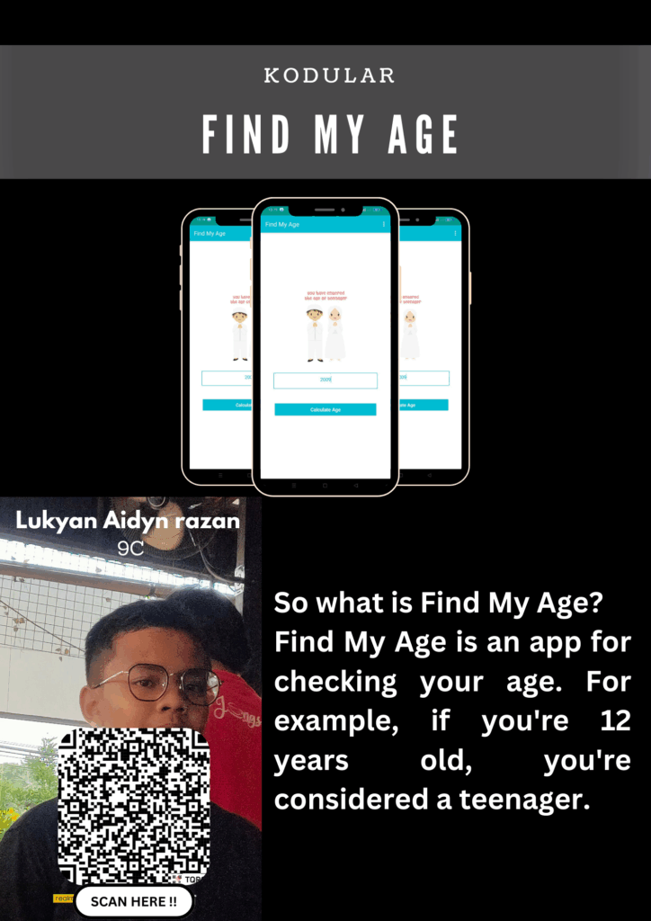 Peace be upon you, and blessings of Allah be upon you, so here I will explain my project this time, namely Find My Age. So, this time we were asked to create an application to determine our age. For example, if we are 15 years old, we are in the teenager category. And I made this project in Kodular. Okay, maybe that’s all the explanation from me. Wassalamuallaikum Warahamatullahi Wabarakatuh.