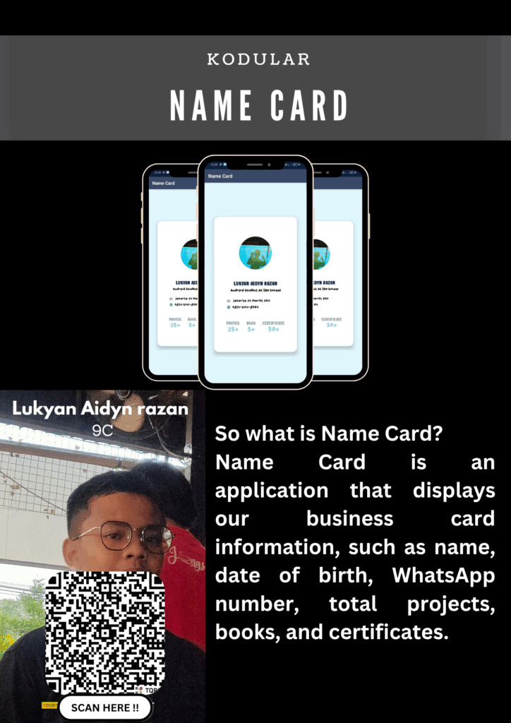 Assalamuallaikum Warahmatullahi Wabarakatuh So here I will explain my project this time, namely Name Card. So in this project we are asked to make our own name card, in this name card there is our status, date of birth, WA number, and total projects, books, and certificates. Okay, maybe that’s all the explanation from me. Wassalamuallaikum Warahmatullahi Wabarakatuh.