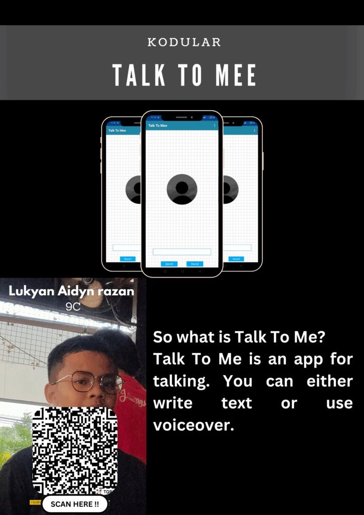 Assalamuallaikum Warahmatullahi Wabarakatuh, so here I will explain my project this time, namely Talk To Mee. So this project is for talking by typing the message we want to say or we can also speak and the text comes out, and I made this project in Kodular. Okay, maybe that’s all the explanation from me. Wassalamuallaikum Warahamatullahi Wabarakatuh.