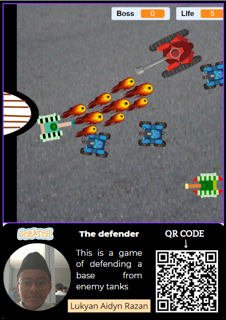 assalamualaikum warahmatullahi wabarakatuh here I will explain about the game I made called The defender. So this game tells us to defend our fort by shooting at the enemies who attack our fort. I made this game with the scratch application. Maybe that’s just a brief explanation from me about the game I made.